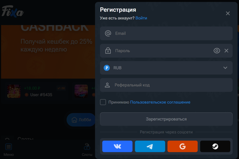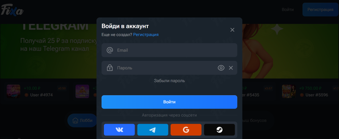 Дополнительно, игроки могут создать аккаунт с помощью социальных сетей: Вконтакте, Телеграм, Google+, Steam. Если у гемблера есть уже активный профиль в онлайн казино Fixa, то ему не нужно регистрировать еще один аккаунт, достаточно выполнить авторизацию в существующий.