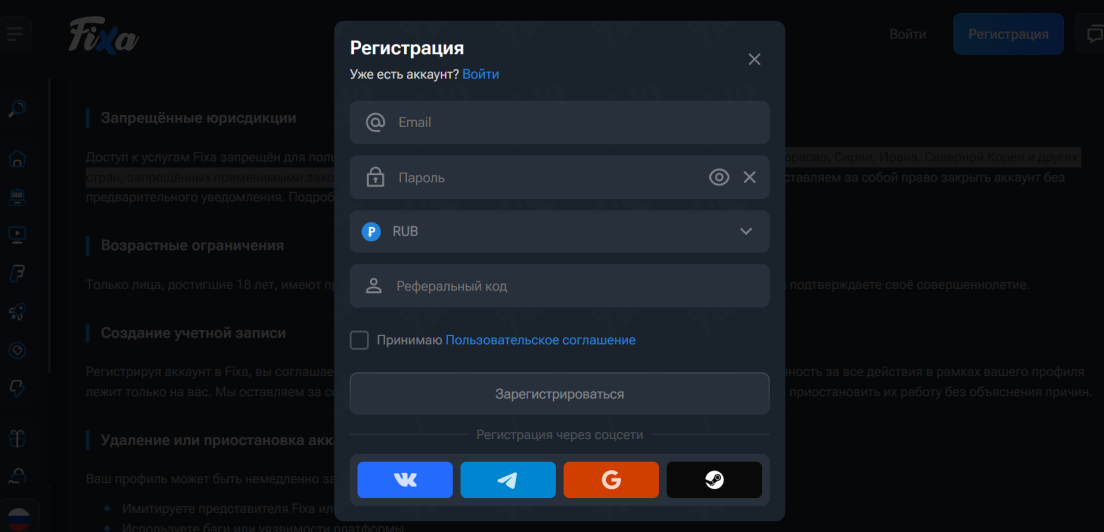 Если у вас уже есть аккаунт в Fixa, то не нужно снова регистрироваться в зеркале. Достаточно, выполнить вход, используя личные данные.